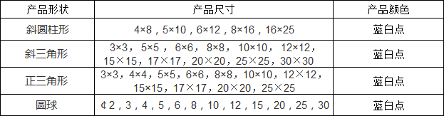 此種研磨石用于鐵、不銹鋼、白鐵、粉末冶金(磁鐵)等材質(zhì)較硬的產(chǎn)品去批鋒、毛邊、倒角、去銹、去氧化皮、粗磨,主要有圓形、三角形、斜三角形、斜圓柱形,用戶可以根據(jù)工件的形狀及大小來選擇研磨石的規(guī)格,以下為此種研磨石的主要規(guī)格:
