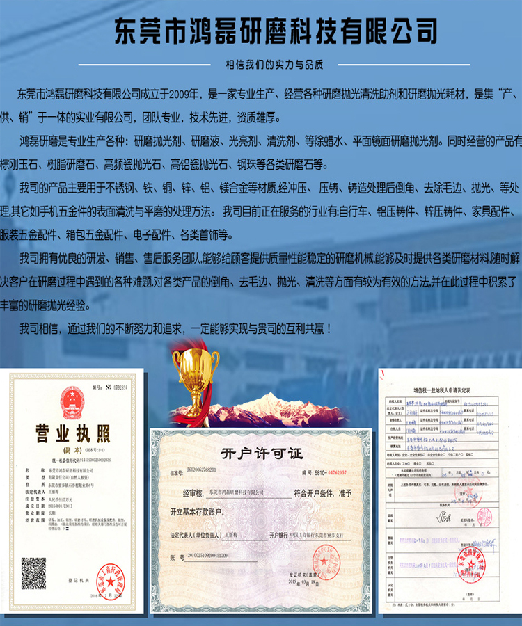 無(wú)水研磨石目前只適合于鋁合金與鋅合金表面的粗磨,也不能達(dá)到很光亮的效果,如果您的工件表面要求沒(méi)有那么高,只需磨掉工件表面氧化層、倒角,批鋒、毛邊等,完全沒(méi)有問(wèn)題!
